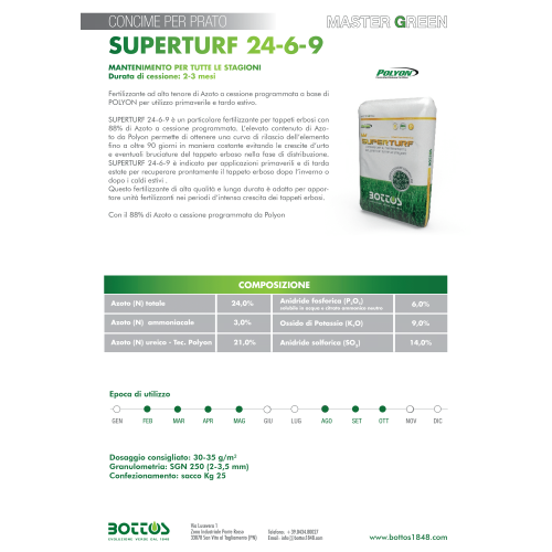MANTENIMENTO PER TUTTE LE STAGIONI Durata di cessione: 2-3 mesi Fertilizzante ad alto tenore di Azoto a cessione programmata a base di POLYON per utilizzo primaverile e tardo estivo. SUPERTURF 24-6-9 è un particolare fertilizzante per tappeti erbosi con 88% di Azoto a cessione programmata. L'elevato contenuto di Azoto da Polyon permette di ottenere una curva di rilascio dell'elemento fino a oltre 90 giorni in maniera costante evitando le crescite d'urto e eventuali bruciature del tappeto erboso nella fase di distribuzione. SUPERTURF 24-6-9 è indicato per applicazioni primaverili e di tarda estate per recuperare prontamente il tappeto erboso dopo l'inverno o dopo i caldi estivi. Questo fertilizzante di alta qualità e lunga durata è adatto per apportare unità fertilizzanti nei periodi d'intensa crescita dei tappeti erbosi. Con il 88% di Azoto a cessione programmata da Polyon COMPOSIZIONE Azoto (N) totale24,0% - Anidride fosforica (P2O5)6,0% solubile in acqua e citrato ammonico neutro Azoto (N)ammoniacale3,0% - Ossido di Potassio (K2O)9,0% Azoto (N) ureico - Tec. Polyon21,0% - Anidride solforica (SO3)14,0% Dosaggio consigliato: 30-35 g/m² Granulometria: SGN 250 (2-3,5 mm) Epoca di utilizzo FEB-MAR-APR-MAG-AGO-SET-OTT
