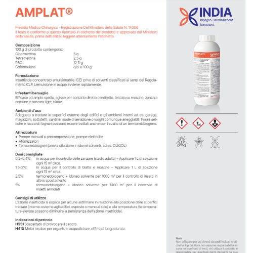 COPYR CIPERTRIN T Insetticida concentrato emulsionabile, abbattente e residuale. Presidio Medico-Chirurgico - Registrazione n. 14740 del Ministero della Salute Composizione 100 g di prodotto contengono Cipermetrina tec. 90% g 2,5 (g 20,2/lt) Tetrametrina tec. 92% g 1,0 (g 8/lt) Piperonil Butossido tec. 88% g 10,0 (g 79,2/lt) Emulsionanti e solventi q.b. a 100 Caratteristiche CIPERTRIN T è un insetticida ad azione abbattente, snidante e residuale per il controllo di una vasta gamma di insetti volanti e striscianti (mosche, zanzare, vespe, scarafaggi, formiche, ragni, pesciolini d'argento, grilli, pulci, ecc.). Per le sue proprietà CIPETRIN T è indicato per la disinfestazione di comunità, alberghi, ospedali, magazzini, mezzi di trasporto, industrie, nonché ambienti ed attrezzature rurali. Modalità di impiego CIPERTRIN T viene impiegato alle dosi da 1 a 3% (da 1 a 3 lt ogni 100 litri d'acqua): per lievi infestazioni e come trattamento di mantenimento, diluire in ragione di 1 lt di CIPERTRIN T per ogni 100 lt d'acqua per medie infestazioni diluire in ragione di 2 lt di CIPERTRIN T per ogni 100 lt d'acqua; per forti infestazioni diluire in ragione di 3 lt di CIPERTRIN T per ogni 100 lt d'acqua. In ogni caso usare sempre la concentrazione maggiore per l'impiego contro gli insetti striscianti. CIPERTRIN T, una volta diluito in acqua, va irrorato sui muri, i pavimenti e le altre Superfici degli ambienti da disinfestare, insistendo particolarmente nel trattamento di angoli, crepe, fessure, in terstizi, tubazioni e di tutti quei punti che possono essere sorgenti di infestazioni o percorsi abituali degli insetti. L'insetticida resta attivo per diverse settimane e la durata dell'azione dipende dalle condizioni di impiego: dosaggio, esposizione alla luce, tipo di superficie trattata, ecc. L'applicazione può essere effettuata con ogni tipo di nebulizzatore, in ragione di 1 lt di soluzione per ogni 10 m2 di superficie. Note E' un insetticida. Leggere attentamente le avvertenze. Quanto riportato sulla presente scheda è con forme all'etichetta approvata dal Ministero della Salute. Informazioni riservate ai tecnici dei settori biocidi e protezione delle piante ed alle Autorità Sanitarie