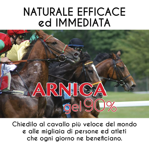 ARNICA GEL 90% - con arnica montana e olio di timo Con arnica montana e olio di timo Gel per uso topico ad elevato contenuto di Arnica. Arnica Officinalis è un gel specifico per muscoli, tendini e articolazioni del cavallo. Contiene il 90% di estratti di Arnica; grazie al brevetto acque officinali, la prima componente del gel è l'estratto in acqua di fiori di arnica, in sinergia con gli estratti glicolicie la tintura madre di arnica. Grazie all'olio essenziale di Menta Piperita, dona un sensodi freschezza e relax. Super concentrata, attiva, in gel morbido, incolore e velocemente assimilabile dalla pelle. Grazie all'abbinamento degli estratti di arnica in alcol, acqua e glicerina consentono a questo gel di apportare al 90% di estratti di arnica attivi. Contiene olio essenziale di Menta ed estratti di Timo e Salvia. L'ARNICA MONTANA: pianta erbacea spontanea che cresce generalmente in montagna oltrei 1200 metri. I principi attivi fitoterapici sono contenuti nei fiori. Modalità d'uso spalmanre sulla parte interessata con movimento circolare, ripetere 2-3 volte e lasciare un velo di 1-2 mm. Avvertenze non fasciare con domopack o plastica. Se si desidere fasciare con carta assorbente o cotone senza stringere la parte. Componenti Arnica montana estratto in acqua, arnica montana estratto glicerico, arnica montana estratto in alcool, sodio, glicerina, glicole, olio di licino, menta piperita olio essenziale, salvia estratto glicolico, timo estratto glicolico, fenossietanolo, alcool benzilico.