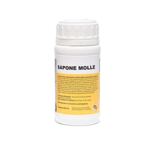 sapone molle il sapone molle in formato liquido si ottiene da potassa e oli vegetali, è altamente biodegradabile, Il sapone molle è idrosolubile e privo di fitotossicità.il sapone molle trova impiego in agrigoltura biologica come fitoprotettivo nei riguardi delle piante verso gli attacchi di insetti. Esplica anche un'azione indiretta contro le fumaggini, poichè favorisce lo scioglimento della melata prodotta dagli insetti fitofagi e aiuta a ripulire le uova deposte sulle foglie. USO spruzzare sulla vegetazione ad una distanza di 20-30 cm nebulizzando in modo omogeneo. diluire 1 cucchiaio da minestra in 1 L di acqua (80-100 ml x 10 L di acqua) e spruzzare sulla vegetazione in modo omogeneo. Frequenza prevedere 2-3 trattamenti a distanza di 7-10gg. trattare nelle ore più fresche della giornata, non miscelare con microelementi. Utilizzabile tutto l'anno. per piante, orto, giardino