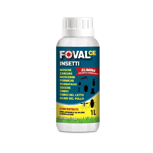 INSETTICIDA CONTRO INSETTI VOLANTI E STRISCIANTI FOVAL CE è un efficace strumento per combattere gli insetti striscianti e volanti nelle zone esterne. È un insetticida con azione abbattente, in particolare se impiegato su superfici non assorbenti, contro insetti volanti (mosche, moscerini, zanzare, zanzara tigre, cimici, ecc.) e striscianti (formiche, scarafaggi, acari dei polli, zecche dei cani, cimici dei letti). Particolarmente indicato per la disinfestazione di comunità, alberghi, scuole, magazzini, depositi, industrie alimentari, attrezzature industriali viene utilizzato nella lotta contro le zanzare nella vegetazione (tappeti erbosi, siepi, cespugli, viali alberati) e contro le mosche negli ambienti rurali, stalle e allevamenti. COMPOSIZIONE PER 100 grammi Cipermetrina 8 grammi (92 g/l) Tetrametrina 2 grammi (23 g/l) Piperonilbutossido 10 grammi (115 g/l) Emulsionanti e acqua q.b. a 100 grammi FORMULAZIONE: liquido DOSAGGIO: 100/200 ml per 10 litri REGISTRAZIONE: Presidio Medico Chirurgico, Registrazione del Ministero della Salute n. 19088