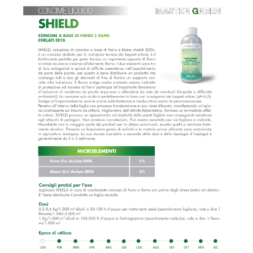 SAFE CHELATO DI MANGANESE E ZINCO CON EDTA SAFE, soluzione di concime a base di Manganese e Zinco chelati EDTA, è un concime studiato per la nutrizione tecnica dei tappeti erbosi; è il fertilizzante universalmente utilizzato per controllare le carenze di Manganese e Zinco per via fogliare e per fertirrigazione. Controlla efficacemente le fisiopatie nutrizionali. I costituenti impiegati per la costruzione del concime sono riconosciute ed autorizzate in agricoltura biologica. Manganese e Zinco sono tra di loro antagonisti e quindi di difficile coesistenza nell'assorbimento da parte delle piante; per questo è bene distribuire un prodotto che contenga tutti e due gli elementi al fine di fornire un supporto corretto alla nutrizione. I due elementi partecipano all'importante fenomeno d'induzione di resistenza (le piante imparano a difendersi da sole da eventuali fisiopatie e difficoltà ambientali). La reazione sub-acida è perfettamente in linea con le esigenze dei tappeti erbosi (pH 6,5). Penetra all'interno della foglia con processo translaminare e non viene dilavato, manifestando un'azione cicatrizzante sui traumi da rottura. Migliorativo dell'attività fotosintetica. SAFE attiva i processi d'ispessimento ed elasticità delle pareti fogliari con conseguenti resistenze agli attacchi di patogeni. Non produce incrostazioni. Miscelabile con la maggior parte dei prodotti per la difesa autorizzati, eccetto quelli a reazione fortemente alcalina. Presenta un bassissimo grado di salinità. La sua durata (variabile a seconda delle dosi e della tipologia d'impiego) è generalmente da 2 a 3 settimane. MICROELEMENTI Manganese(Mn) chelato EDTA 3% Zinco(Zn) chelato EDTA 1% Consigli pratici per l'uso Applicare SAFE in caso di conclamate carenze e prima e/o durante gli stress biotici ed abiotici. E' bene distribuire il prodotto su foglia asciutta. Dosi: 0,5-1 Kg/1.000 m2 diluiti in 100-200 lt d'acqua in fertirrigazione (assorbimento radicale), vale a dire 1 flacone/1.000-2.000 m2 0,15-0,3 Kg/1.000 m2 diluiti in 50-100 lt d'acqua per trattamenti aerei (assorbimento fogliare), vale a dire 1 flacone/3.300-6.500 m 2