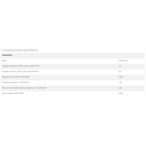 Mobil 1? 0W-20 è un olio motore sintetico a prestazioni avanzate progettato per fornire una straordinaria protezione del motore e un maggiore risparmio di combustibile. Mobil 1 0W-20 incontra o supera i requisiti di vari produttori di veicoli e gli standard del settore ed è più efficiente degli oli tradizionali. Mobil 1 0W-20 è raccomandato per applicazioni SAE 0W-20 e 5W-20. Mobil 1 0W-20 è progettato con una miscela brevettata di basi sintetiche ad alte prestazioni rafforzate da un sistema di additivazione bilanciato con precisione. La bassa viscosità e la formula innovativa totalmente sintetica aiutano a migliorare l'efficienza energetica del motore ed il risparmio di combustibile. Mobil 1 0W-20 fornisce la protezione alle alte temperature degli oli di maggiore viscosità e nel contempo offre il miglior risparmio di combustibile nella linea Mobil 1. Le prerogative principali e i potenziali benefici includono: -Bassa viscosità e formula innovativa totalmente sintetica -Straordinaria stabilità termica e all'ossidazione -Prestazioni eccezionali alle basse temperature -Additivazione sapientemente bilanciata Applicazioni Mobil 1 0W-20 è raccomandato dalla ExxonMobil per le applicazioni SAE 5W-20 e 0W-20 in tutti i tipi di veicoli passeggeri, SUV, furgoni e camion leggeri alimentati a benzina. ? Mobil 1 0W-20 è progettato per contribuire a fornire un'eccezionale protezione del motore e i benefici derivanti dal risparmio di combustibile. ? Mobil 1 0W-20 è raccomandato per condizioni di freddo estremo per contribuire a fornire un avviamento rapido e una lubrificazione veloce. ? Mobil 1 0W-20 non è raccomandato per motori a 2 tempi o motori aeronautici, salvo specifica approvazione del costruttore. Questo prodotto è raccomandato per l'utilizzo in applicazioni che richiedano: GM 6094M API CF API Energy Conserving (SM) ILSAC GF-3 ILSAC GF-4 Fiat Chrysler Automotive MS-6395 Questo prodotto incontra o supera i requisiti di: API SN API SM API SL API SJ Ford WSS-M2C947-A API SN PLUS API SN Resource Conserving Ford WSS-M2C947-B1 ILSAC GF-6A FORD WSS-M2C962-A1 API SN PLUS RESOURCE CONSERVING API SP Resource Conserving API SP Caratteristica Grado Viscosità cinematica a 40°C, mm2/s, ASTM D 445 45 Viscosità cinematica a 100°C, mm2/s, ASTM D 445 8,8 Indice di viscosità, ASTM D 2270 169 Viscosità HTHS a 150° C, mPa.s, ASTM D 4683 2,6 Punto di scorrimento, °C, ASTM D 97 -51 Punto di infiammabilità, Cleveland Open Cup, °C, ASTM D 92 224 Fosforo, %peso, ASTM D4951 0,08 Ceneri solfatate, % peso, ASTM D 874 0,9 Densità a 15,6 C°, g/cm3, ASTM D 4052 0,838