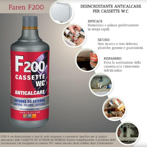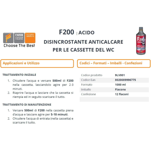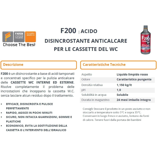 Risolve i grossi problemi di manutenzione nel vasto settore dell'edilizia e dell'industria. E' ottimo per pulire ed eliminare incrostazioni di malta e cemento, oppure in casi particolari per eliminare incrostazioni di calcare da impianti e serpentine. Ha un eccellente diluibilità in acqua con la conseguente riduzione dei costi di esercizio. F400 risolve il problema delle incrostazioni di cemento laddove spesso altri prodotti o rimedi hanno fallito, evitando nella maggioranza dei casi di dover intervenire meccanicamente, con notevoli costi di esercizio quali tempo e manodopera. Nonostante sia una composizione di acidi concentrati, la formulazione è ben tamponata e assicura, previo l'utilizzo dei normali sistemi di protezione, una buona sicurezza per l'operatore. E' un prodotto professionale, studiato per le esigenze industriali. Come Edilizia e Industria Applicare F4.00 con spruzzatore, pompa a bassa pressione o a pennello direttamente sulla parte da trattare, continuando l'applicazione fino a quando non si nota più' alcuna reazione "effervescente", risciacquare sempre con acqua dopo l'applicazione al fine di rimuovere ogni residuo di acido. Normalmente, soprattutto per la rimozione di incrostazioni di malta e cemento, può' esserci la necessità di utilizzare il prodotto puro. Impianti o serpentine Per lavaggi disincrostanti di impianti o serpentine il prodotto va prediluito o diluito in funzione di 1 parte con 5-10 parti di acqua, avendo cura di utilizzare una soluzione acqua-acido che non superi di capacità i 2 terzi dell'impianto. Tutte le superfici trattate con F400 vanno sempre risciacquate e qualora la situazione lo rendesse opportuno anche protette con specifici prodotti oleosi. Dove Tubi Innocenti, Morsetterie, Pannelli ( legno o metallo ) per Armature Betoniere e Autobetoniere Attrezzature Edili in genere Pavimentazioni con forti incrostazioni di Cemento o Malte, purché resistenti all'azione acida Stampi nel settore della pressofusione Pompe di ricircolo dell'acqua nello stampaggio della plastiche e delle materie plastiche