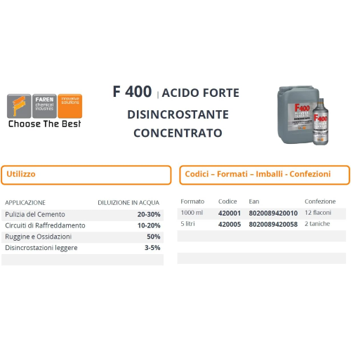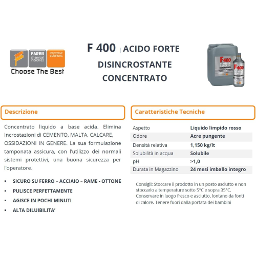 Faren prodotti Made in Italy DECAL VR 27 è un disincrostante a base di acidi inorganici e tamponati, additivi antischiuma e speciali inibitori di corrosione Specifico per la rimozione di calcare, carbonati, fosfati, ossidi e solfuri. Ripristina il corretto scambio termico e migliora il rendimento degli impianti La formulazione a viraggio di colore permette di verificare immediatamente la corretta azione dell'acido UTILIZZO: Diluito in acqua, in misura dal 10% al 20% ( 1/2 litri ogni 10 di acqua ) a seconda dell'entità delle incrostazioni
