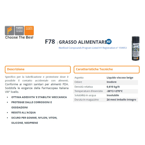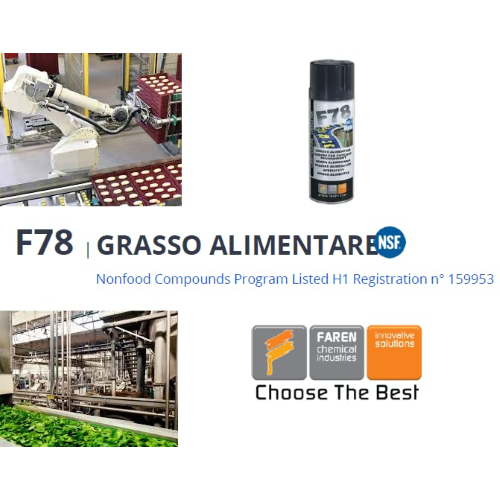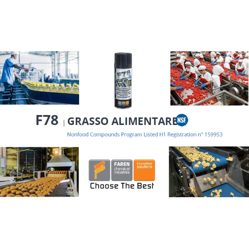 Specifico per la lubrificazione e protezione di organi di macchine ove sia possibile il contatto con alimenti: pastifici, panifici, industria conserviera, del confezionamento e dell'imbottigliamento, lavorazione della frutta, produzione del gelato, impianti di erogazione di acqua potabile. Alto potere lubrificante. Fattore di velocità per cuscinetti volventi 500.000. Elevata resistenza all'acqua ed al dilavamento. Eccellente affinità alle superfici metalliche e forte potere anticorrosivo nei confronti di acciai e leghe di rame. Buona compatibilità con gli elastomeri di guarnizioni e giunti di tenuta (da verificare specificatamente). Insolubile in acqua, ove eventualmente galleggia. Conforme ai Registri Sanitari per alimenti RGSA 37-00218/B; RSIPAC 37-04761 CAT; FDA; USDA tipo H-1; ISO 6743/9, grasso tipo L-XBCHB2; DIN 51825 grasso tipo KP2K-20.