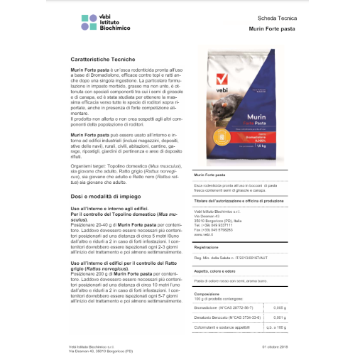 MURIN FORTE PASTA è un'esca rodenticida pronta all'uso a base di Bromadiolone, efficace contro topi e ratti anche dopo una singola ingestione. La particolare formulazione in impasto morbido, grasso ma non unto, è ottenuta con speciali componenti tra cui i semi di girasole e di canapa, ed è stata studiata per ottenere la massima efficacia verso tutte le specie di roditori sopra riportate, anche in presenza di forte competizione alimentare. MURIN FORTE PASTA può essere usato all'interno e intorno ad edifici industriali (inclusi magazzini, depositi, stive delle navi), rurali, civili, abitazioni, cantine, garage, ripostigli, giardini di pertinenza e aree di deposito rifiuti.