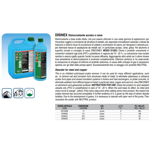 Disincrostante serpentine caldaie e scambiatori DESCRIZIONE: Disincrostante a base acida inibito, che può essere utilizzato in una vasta gamma di applicazioni: per rimuovere ruggine e corrosione da strutture di metallo, per asportare incrostazioni calcaree o silicee da tubazioni e sistemi chiusi di circolazione di caldaie e scambiatori di calore, per decapare il calcestruzzo, per eliminare tracce di ossidazione da metalli vari. In particolar modo acciaio, rame, ghisa. Non indicato per alluminio e superfici zincate, per i quali si consiglia di utilizzare i prodotti della Serie ZINCONEX. MODO D'USO: Diluire DISINEX unicamente in contenitori resistenti agli acidi (PVC o polietilene) in ragione del 10 -20 % rispetto il liquido totale (quindi 10 - 20 lt di prodotto ogni 100 lt d'acqua), preoccupandosi di aggiungere acqua al DISINEX e non viceversa. La colorazione rosa-violacea iniziale cambia in arancio-giallo quando l'acido ha perso efficacia. Aggiungendo altro acido se il colore rimane rosa persistente la disincrostazione è avvenuta completamente. Ulteriore certezza si ha osservando la cessazione di sviluppo di bollicine di anidride carbonica. A causa dello sviluppo di gas è necessario operare con gli sfiati della pompa aperti. Successivamente fare un lavaggio con prodotto neutralizzante NEUTRAL. DATI TECNICI: Colore rosa - violaceo Odore pungente pH (soluzione al 10 %) 1,2 ± 0,2 Densità relativa 1,160 ± 0,010 g/cm³ Solubilità in acqua completa Punto di ebollizione 85 °C PRECAUZIONI PER LA SICUREZZA E LA SALUTE: Normali accorgimenti di manipolazione dei prodotti chimici corrosivi operando in modo da evitarne il contatto e l'inalazione. Non fumare, non mangiare, non bere durante la manipolazione. Conservare negli imballi originali, in luogo fresco e ventilato. Mantenere chiusi i recipienti quando non è utilizzato. Per maggiori informazioni consultare la scheda dati di sicurezza. INGREDIENTI: Acido Cloridrico, Acqua, Acido Solforico, coloranti.