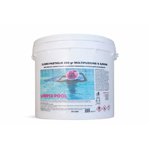 Il Cloro Limpia Pool Multifunzione 6 Azioni è un agente chimico Igienizzante, Battericida, Funghicida, Antialghe, Schiarente, Flocculante e Stabilizzante di ph. Come prodotto chimico per l'igienizzazione e depurazione dell'acqua della piscina, il Cloro Depuro Sicuro Multifunzione 6 Azioni si presenta a forma di pastiglie di tricloro con puntini blu da 200 gr. Limpia Pool Multifunzione 6 Azioni è il miglior cloro attualmente sul mercato grazie alla sua purezza, solubilità e persistenza. Dopo l'utilizzo di Limpia Pool, noterete subito la differenza: -acqua limpida, -cloro residuo presente, ma senza l'odore pungente di cloro. Inoltre, analizzando l'acqua troverete il cloro ed il ph stabili grazie alla sua speciale formulazione. Il Cloro Limpia Pool in compresse da 200 gr Multifunzione 6 Azioni a base di Tricloro ha una concentrazione del 90% circa di Cloro utile, un contenuto proporzionato di Antialghe, la dose esatta di flocculante ed uno stabilizzante di ph. Con questi quattro principi attivi esplica 6 funzioni perché le riunisce in un solo pastiglione. Limpia Pool Multifunzione 6 Azioni ha un giusto grado di solubilità, ciò significa che si scioglie lentamente essendo a rilascio prolungato. Adatto nei dosatori di cloro e direttamente nello Skimmer. L'utilizzo di Limpia Pool Multifunzione 6 Azioni rende inattivi un ampio spettro di agenti patogeni (batteri e virus) naturalmente presenti nell'acqua della piscina. È un potente agente ossidante e disinfettante. L'uso regolare di Limpia Pool garantisce un acqua limpida. E' facilmente misurabile e dosabile.