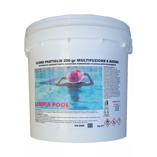 Il Cloro Limpia Pool Multifunzione 6 Azioni è un agente chimico Igienizzante, Battericida, Funghicida, Antialghe, Schiarente, Flocculante e Stabilizzante di ph. Come prodotto chimico per l'igienizzazione e depurazione dell'acqua della piscina, il Cloro Depuro Sicuro Multifunzione 6 Azioni si presenta a forma di pastiglie di tricloro con puntini blu da 200 gr. Limpia Pool Multifunzione 6 Azioni è il miglior cloro attualmente sul mercato grazie alla sua purezza, solubilità e persistenza. Dopo l'utilizzo di Limpia Pool, noterete subito la differenza: -acqua limpida, -cloro residuo presente, ma senza l'odore pungente di cloro. Inoltre, analizzando l'acqua troverete il cloro ed il ph stabili grazie alla sua speciale formulazione. Il Cloro Limpia Pool in compresse da 200 gr Multifunzione 6 Azioni a base di Tricloro ha una concentrazione del 90% circa di Cloro utile, un contenuto proporzionato di Antialghe, la dose esatta di flocculante ed uno stabilizzante di ph. Con questi quattro principi attivi esplica 6 funzioni perché le riunisce in un solo pastiglione. Limpia Pool Multifunzione 6 Azioni ha un giusto grado di solubilità, ciò significa che si scioglie lentamente essendo a rilascio prolungato. Adatto nei dosatori di cloro e direttamente nello Skimmer. L'utilizzo di Limpia Pool Multifunzione 6 Azioni rende inattivi un ampio spettro di agenti patogeni (batteri e virus) naturalmente presenti nell'acqua della piscina. È un potente agente ossidante e disinfettante. L'uso regolare di Limpia Pool garantisce un acqua limpida. E' facilmente misurabile e dosabile.