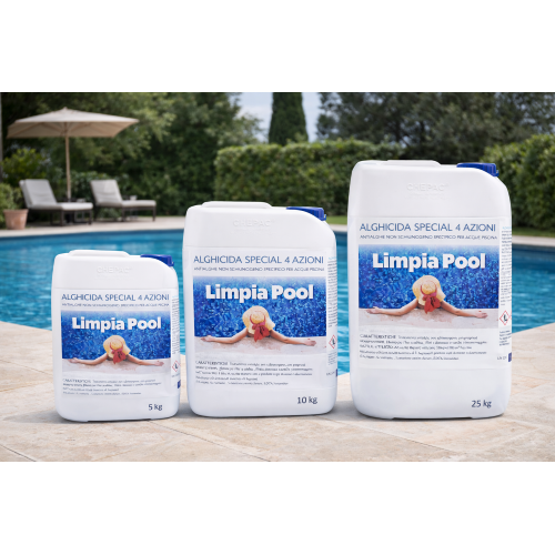 Limpia Pool è un Alghicida Sistemico 4 azioni Azzurrante, Schiarente, Battericida, Fungicida con azione complementare Sequestrante Liquido Non Schiumogeno.