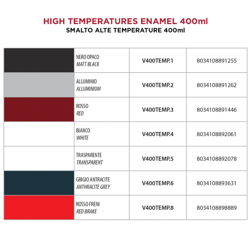 Vernice spray alte temperature (smalto) di elevata qualità, a base di resine siliconiche modificate, che consente di rinnovare tutte le superfici normalmente soggette ad alte temperature. Resiste al calore fino a punte di 300°C-700°C (vedere Scheda Tecnica).