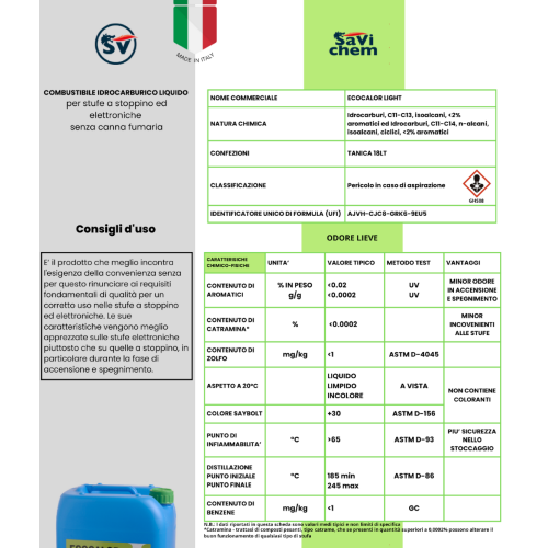 Il combustibile Savichem che meglio incontra l'esigenza della convenienza senza per questo rinunciare ai requisiti fondamentali di qualità per un corretto uso nelle stufe a stoppino ed elettroniche. Le sue caratteristiche vengono meglio apprezzate sulle stufe elettroniche, in particolare durante la fase di accensione e spegnimento.